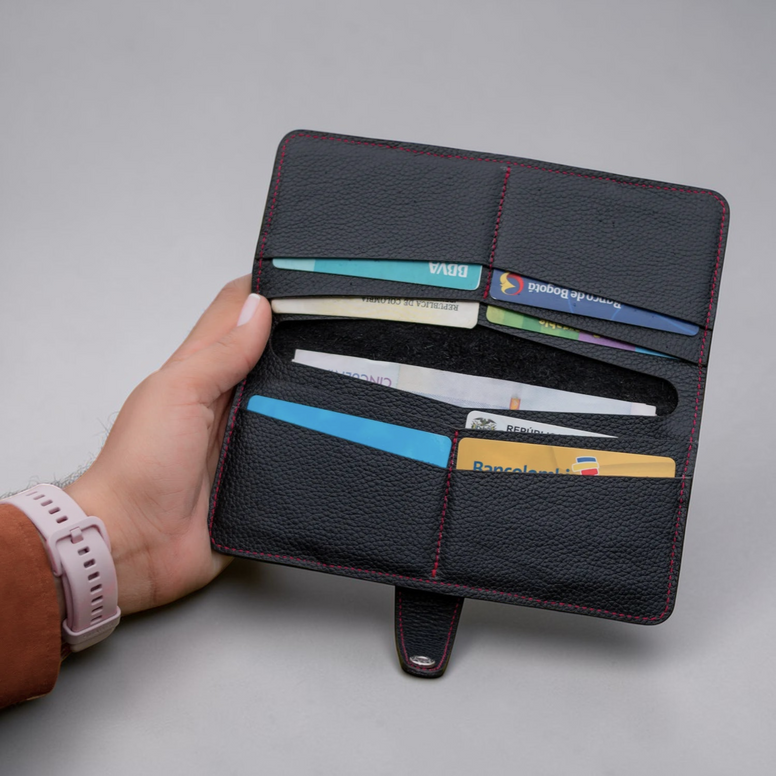 - Ocho compartimentos para documentos y un gran compartimiento central para que leves todos los billetes y lo que te haga falta.