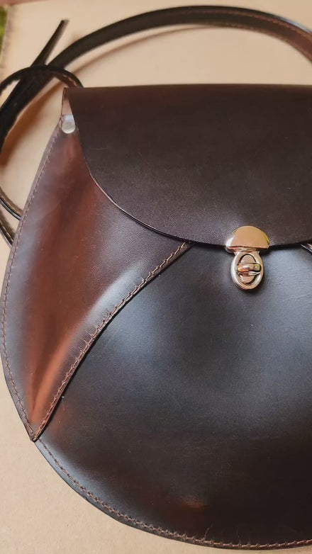 Este bolso parte de una silueta poco común: una forma semi esférica que se siente equilibrada, y diferente. Está fabricado a mano en cuero genuino natural, un material con cuerpo, textura naturales que le dan profundidad sin necesidad de adornos.