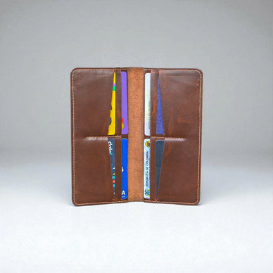 Billetera estilizada con ocho compartimentos para documentos y dos para efectivo, acabada a mano para máxima resistencia y elegancia.